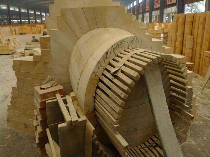 爐腰:起著緩沖上升煤氣流的作用。爐料在這里已部分還原造渣,透氣性較差,故爐腰直徑有逐漸擴(kuò)大之勢(shì)。爐腰髙度則不易過高,大高爐一般為2m左右,如某1000m3高爐,其爐腰高度僅616mm。另外,因?yàn)闋t腰部位的物料沖刷嚴(yán)重,所以爐腰是髙爐的一個(gè)薄弱環(huán)節(jié)。榮盛耐材技術(shù)人員會(huì)為您提供合理施工方案。